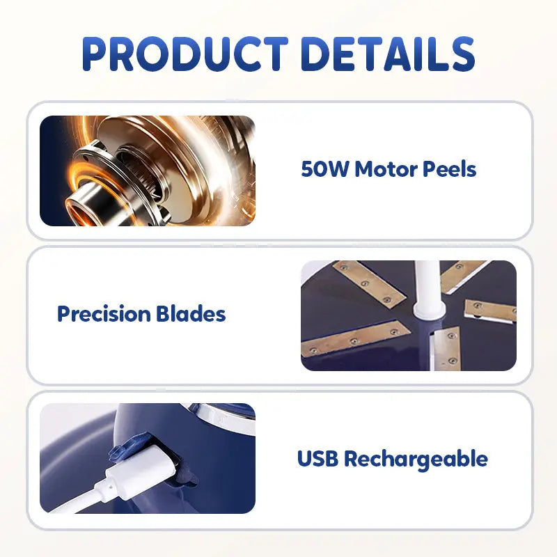 Skræl som magi, ingen sved, intet rod – Tryk blot på en knap, og lad maskinen gøre arbejdet – perfekt skrællet frugt på bare 25 sekunder. 50W-motoren skræller kraftfuldt, men forbliver lydløs takket være intelligent køleteknologi, der forhindrer overophedning.